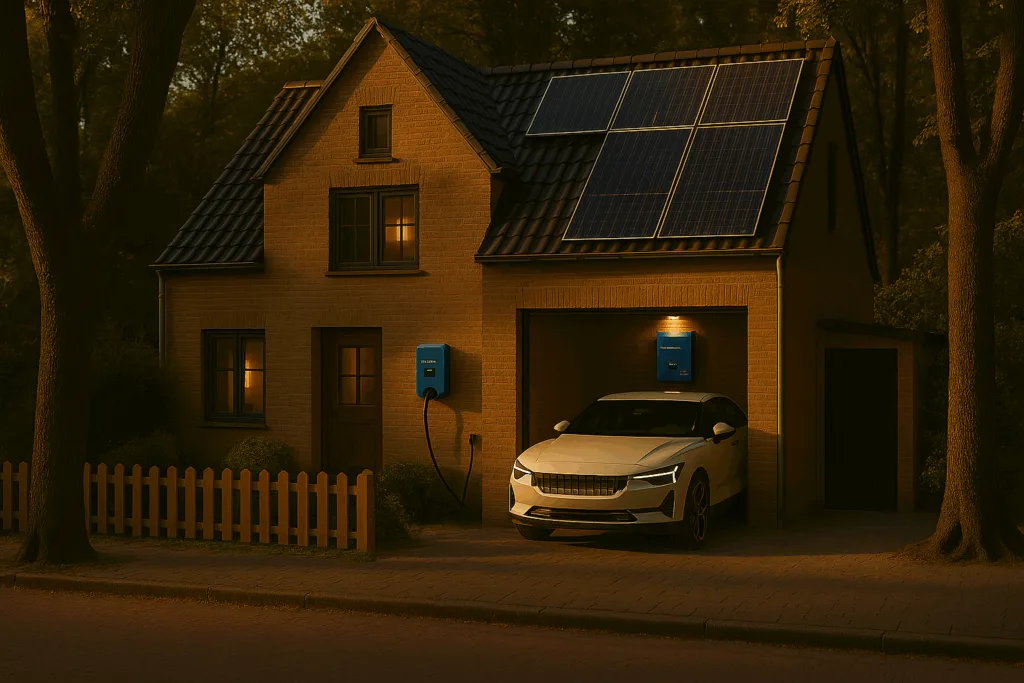 De Victron laadpaal past naadloos bij de thuisbatterij en maakt optimaal gebruik van energie uit uw zonnepanelen en thuisbatterij.